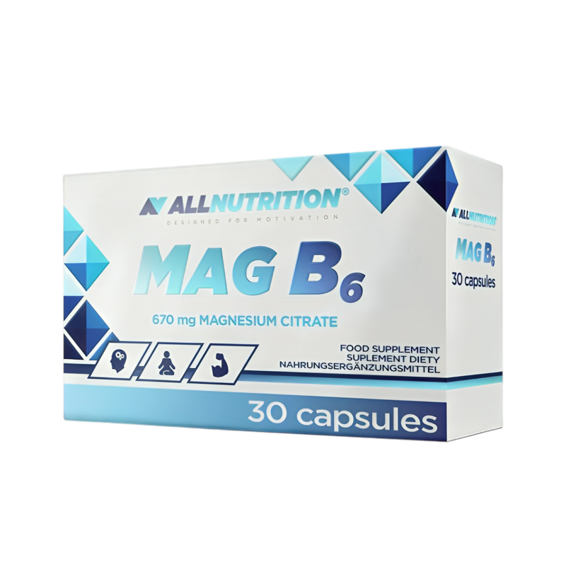 Allnutrition MAG B6 är ett praktiskt kosttillskott i lättsväljande kapslar som kombinerar magnesiumcitrat och vitamin B6 för att komplettera ditt dagliga intag. Produkten stödjer nervsystemets normala funktion, bidrar till normal energiomsättning samt hjälper till att minska trötthet och utmattning. Magnesium bidrar dessutom till normal muskelfunktion och elektrolytbalans — perfekt att ta hemma, på jobbet eller efter träning.