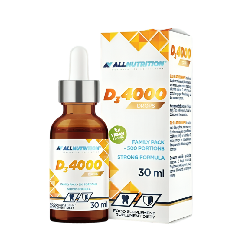 Allnutrition Vit D3 4000 Drops är ett flytande kosttillskott med vitamin D3 i lättdoserade droppar, framtaget för att enkelt komplettera ditt dagliga intag. Varje portion innehåller 4000 IU (100 µg) vitamin D3 i en mycket liten mängd vätska, vilket gör det enkelt att få en koncentrerad och pålitlig dos. Vitamin D bidrar till immunsystemets normala funktion samt till att upprätthålla normal benstomme, muskelfunktion och ett normalt upptag av kalcium.
