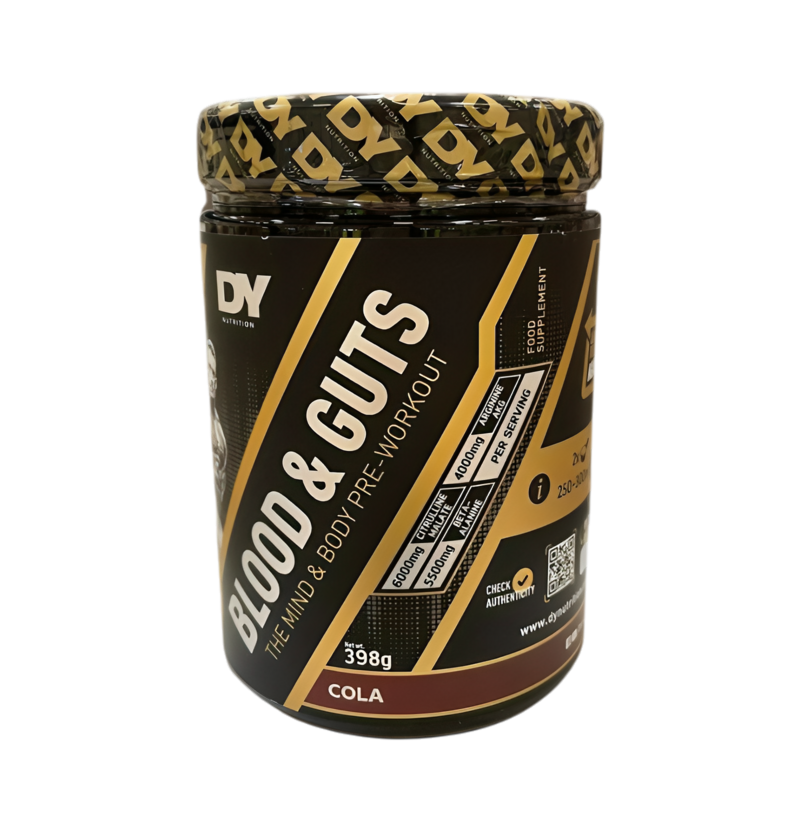 Blood and Guts Cola är ett pre-workoutpulver framtaget för att användas cirka 30 minuter före träning. Formulan kombinerar L-Citrulline Malate och Beta-Alanine med A-AKG (L-Arginine), L-Tyrosine och koffein från flera källor för en balanserad PWO-profil. Produkten innehåller även niacin (vitamin B3) samt växtextrakt från grönt te, guarana och apelsinskal. Enkel att blanda med vatten och levereras med en tydlig Cola-smak som gör uppladdningen både smidig och smakfull.