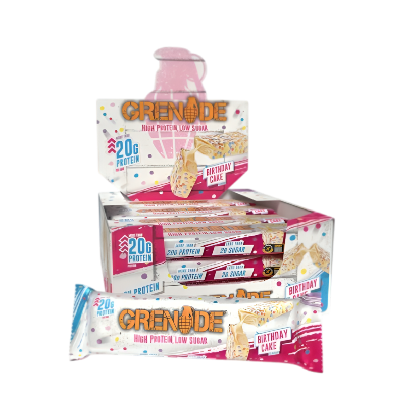 Grenade Protein Bars kombinerar hög proteinhalt med en lekfull och dessertinspirerad smakprofil. Baren är överdragen med vit choklad och har en smak som för tankarna till klassisk födelsedagstårta, komplett med färgglada strössel. Den är framtagen för dig som vill ha ett funktionellt mellanmål, men som samtidigt värdesätter smak och variation.