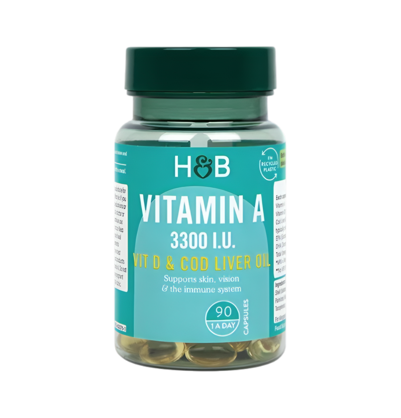 Holland & Barrett Vitamin A 3300IU är ett smidigt kosttillskott i kapslar för dig som vill komplettera intaget av vitamin A tillsammans med vitamin D3 och naturliga omega‑3‑fettsyror från levertran. Per kapsel får du 3300 IU vitamin A (≈990 µg), 10 µg vitamin D3 samt små mängder EPA och DHA. Vitamin A bidrar till att bibehålla normal syn och hud, medan vitamin D3 bidrar till immunsystemets normala funktion. Den lilla kapselformen gör det enkelt att ta en gång om dagen i samband med måltid.