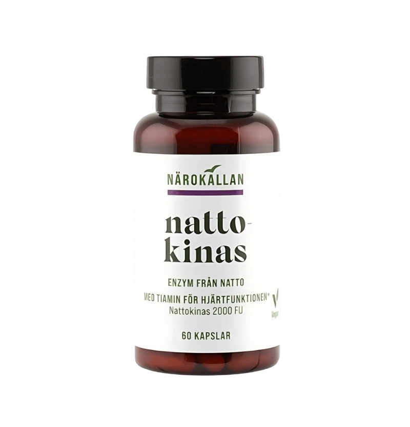 Närokällan Nattokinas är ett kosttillskott som innehåller 2000 FU (fibrinolytiska enheter) nattokinas per kapsel – ett enzym som utvinns från fermenterade sojabönor (Glycine max). Produkten är dessutom förstärkt med tiamin (vitamin B1) i en högdoserad mängd om 10 mg per kapsel, motsvarande 909 % av det dagliga referensintaget (DRI). En kapsel om dagen räcker för en komplett dos, vilket gör den enkel att integrera i din dagliga rutin.