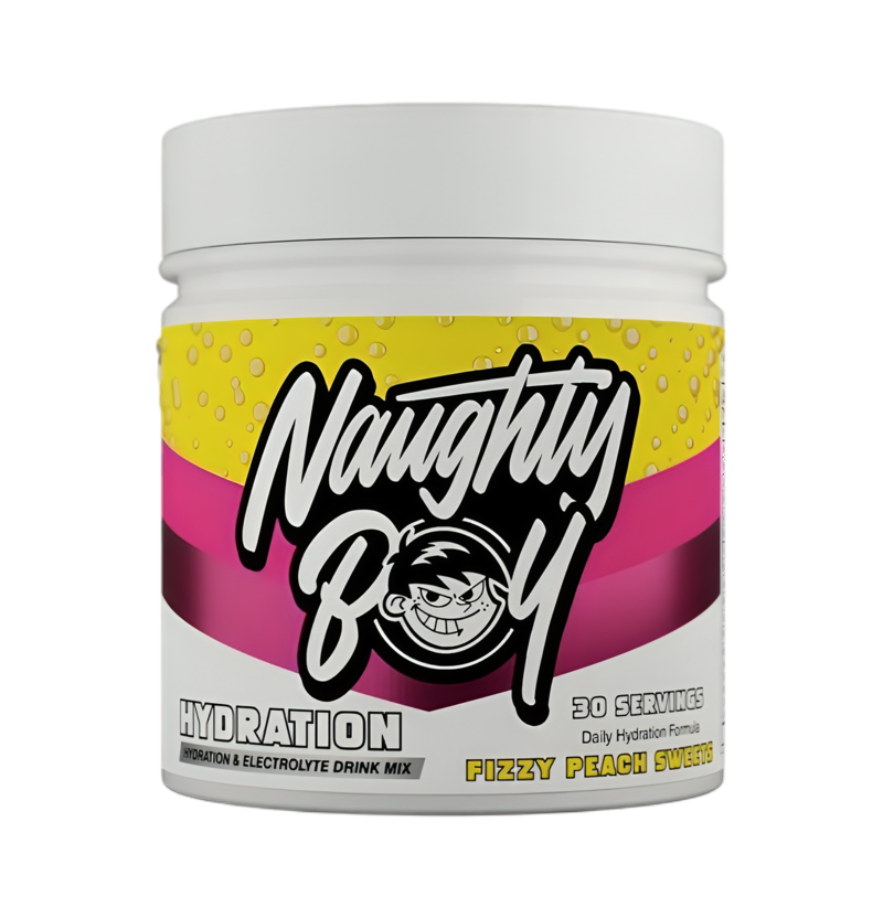Naughty Boy Hydration är ett lättlösligt elektrolytpulver som hjälper dig fylla på vätska och mineraler före, under och efter träning. Produkten innehåller viktiga elektrolyter — magnesium, kalium, natrium och klorid — där magnesium bidrar till elektrolytbalans och normal muskelfunktion. Pulverets Fizzy Peach Sweets-smak ger en frisk och läskande dryck, och formulan är även berikad med taurin, kreatin monohydrat samt frukt- och bärextrakt för extra stöd vid återhämtning.