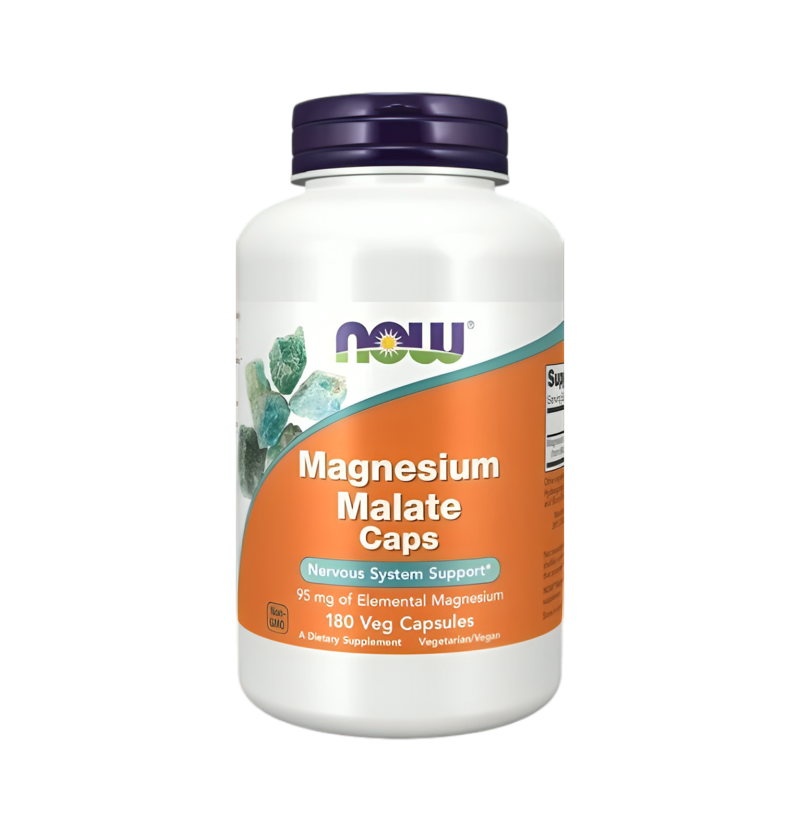 NOW Foods Magnesium Malate är ett smidigt magnesiumtillskott i vegetabiliska kapslar. Varje kapsel innehåller 840 mg magnesiummalat, vilket motsvarar 95 mg elementärt magnesium. Produkten är utformad för att komplettera det dagliga intaget och passar både en aktiv vardag och träning. Magnesium bidrar till normal energiomsättning, muskelfunktion och nervsystemets normala funktion samt till elektrolytbalans och att minska trötthet och utmattning. Ta 1 kapsel dagligen, helst i samband med måltid.