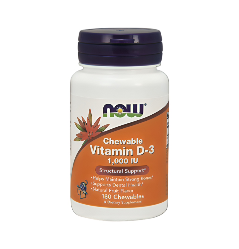 NOW Foods Vitamin D-3 1000 IU tuggtabletter är ett enkelt och gott kosttillskott med kolekalciferol (vitamin D3) i fruktsmak. Varje tuggtablett ger 1000 IU D3 och bidrar till immunsystemets normala funktion, bibehållen benstomme samt ett normalt upptag av kalcium. De tuggbara tabletterna kräver inget vatten och är lätta att ta för både vuxna och barn från 5 år.