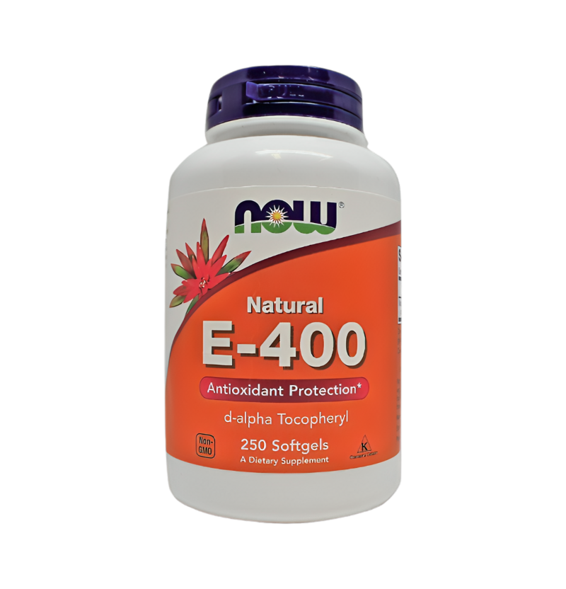 NOW Foods Vitamin E-400 Natural är ett kosttillskott i mjuka kapslar som innehåller vitamin E i form av d-alfa-tokoferylacetat, vilket är en naturlig form av vitamin E. Varje kapsel ger 268 mg vitamin E, motsvarande 2233 % av näringsreferensvärdet (NRV). Produkten levereras i en stor förpackning med 250 softgels och är avsedd för dagligt bruk.