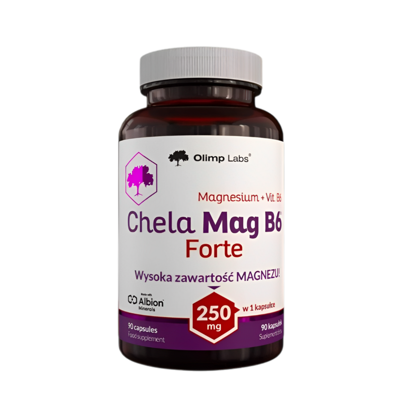 Olimp Chela-Mag B6 Forte är ett kosttillskott i kapselform som innehåller magnesium i form av magnesiumbisglycinat (aminosyrakelat från Albion®), kombinerat med vitamin B6. Produkten är framtagen för dagligt intag och varje kapsel innehåller 250 mg magnesium samt 2 mg vitamin B6.