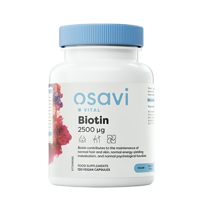 Osavi Biotin 2500mcg är ett enkelt och effektivt kosttillskott i veganska kapslar för dig som vill komplettera med vitamin B7 (biotin). Varje kapsel innehåller 2500 mcg biotin och tas lätt som en del av din dagliga rutin. Biotin bidrar till normalt hår och normal hud samt till normal energiomsättning och nervsystemets normala funktion.