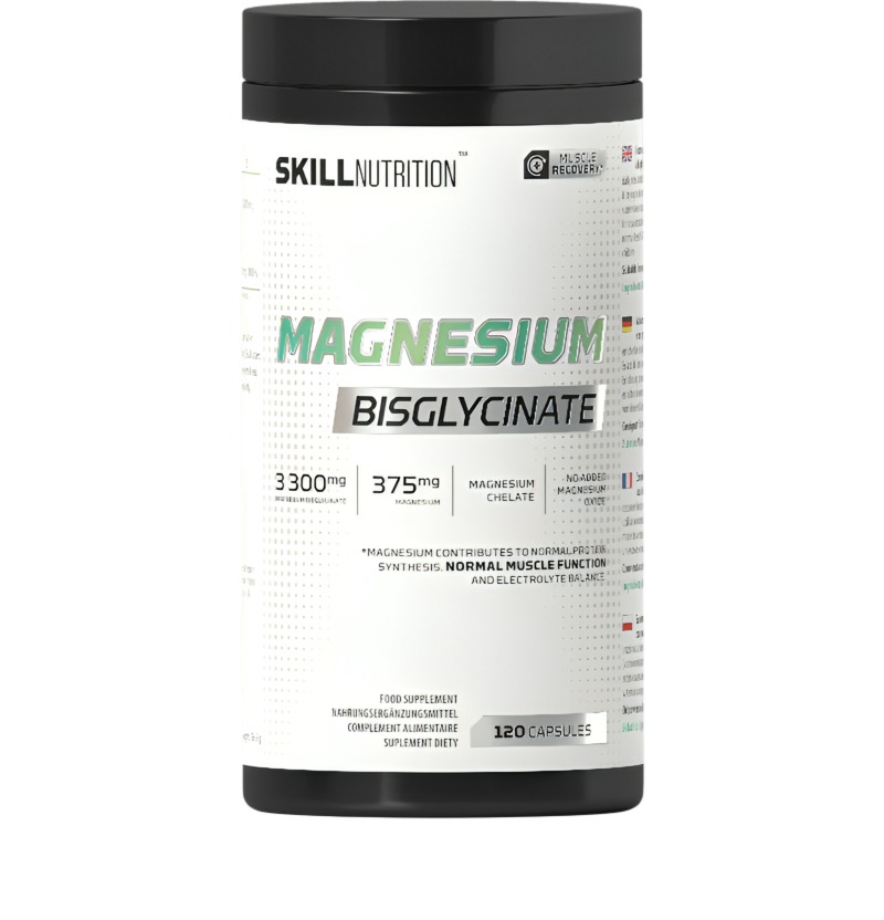 Magnesium Bisglycinate från Skill Nutrition är ett praktiskt tillskott i vegetabiliska kapslar, framtaget för att ge ett jämnt och effektivt magnesiumintag. En portion om 3 kapslar innehåller 375 mg magnesium från magnesiumbisglycinat — en form som är skonsam för magen och lätt att ta upp. Magnesium bidrar till normal muskelfunktion och nervsystemets normala funktion samt hjälper till att minska trötthet och utmattning, vilket gör detta tillskott lämpligt både vid träning och i en aktiv vardag.