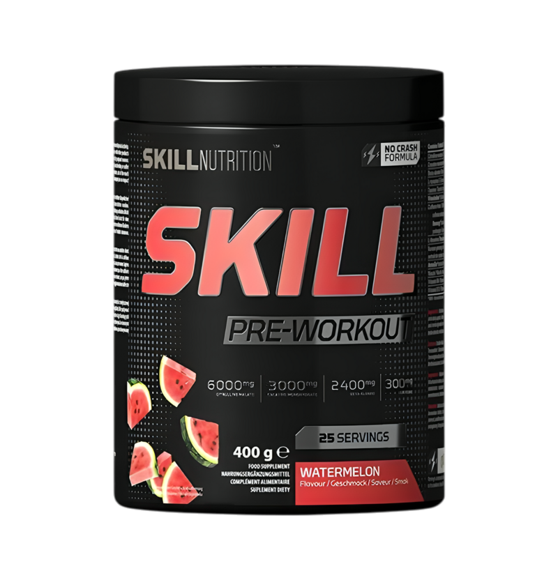 Skill Pre-Workout är ett högkvalitativt kosttillskott i pulverform, framtaget för aktiva personer som vill ha en kraftfull formula före träning. Produkten kombinerar välkända ingredienser som citrullinmalat, kreatinmonohydrat, beta-alanin och taurin med vitaminer och växtextrakt. Varje portion innehåller även 300 mg koffein från flera källor, inklusive te, kaffe och ginseng. Med smaken Watermelon får du en fräsch och fruktig pre-workout som är enkel att blanda.