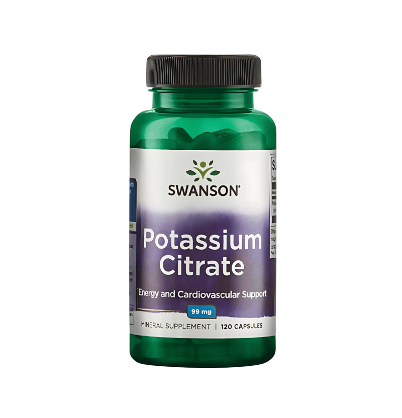 Swanson Potassium Citrate är ett kosttillskott som innehåller kalium i form av kaliumcitrat, en lättlöslig och biotillgänglig form av mineralet. Varje kapsel ger 99 mg kalium, vilket motsvarar 2 % av det dagliga referensintaget (DRI). Kalium är en essentiell mineral som finns naturligt i kroppen och spelar en viktig roll i flera fysiologiska processer. Eftersom kroppen inte själv kan producera kalium behöver det tillföras via kosten eller kosttillskott.