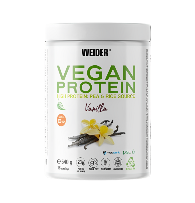 Weider Vegan Protein Vanilla är ett växtbaserat proteinpulver utvecklat för dig som vill komplettera kostens proteinintag med en mild och krämig vaniljsmak. Basen är 91% ärtproteinisolat i kombination med risprotein och en noga utvald spannmålsmix (ModCarb). Produkten innehåller även vitamin B12. Varje portion ger 23 g protein och blandas smidigt med vatten till en len proteinshake — fungerar lika bra i smoothies, havregrynsgröt eller vid bakning.