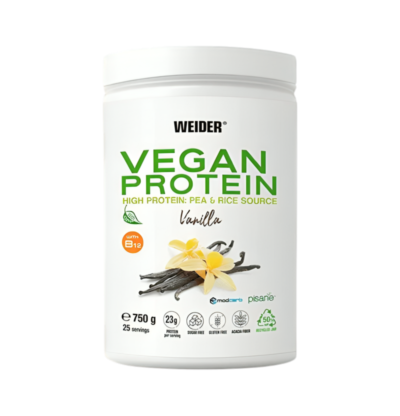 Weider Vegan Protein Vanilla är ett 100% växtbaserat proteinpulver baserat på ärtproteinisolat och risprotein, utvecklat för att enkelt komplettera ditt dagliga proteinintag. Varje portion ger 23 g protein och en mjuk vaniljsmak som passar lika bra i shaker som i smoothies. Produkten innehåller vitamin B12 samt en mild spannmåls- och fröblandning av havre, quinoa, amarant, bovete och hirs för behaglig textur. Sötad med stevia och lätt att blanda i vatten.
