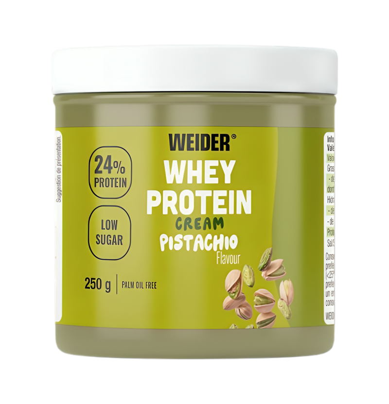Weider Whey Protein Cream Pistachio är en fyllig och krämig proteinkräm med tydlig pistachiosmak. Produkten kombinerar vassleproteinkoncentrat, 15% pistachio-pasta och skummjölkspulver för en balanserad smak och len konsistens. Sötad med maltitol för en rund och behaglig sötma utan traditionellt socker. Levereras i en praktisk 250 g burk — perfekt för frukostbordet eller som ett proteinrikt tillägg i vardagen.